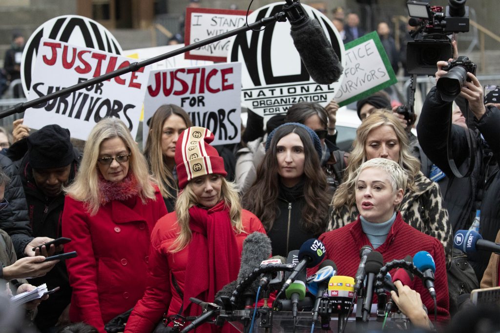Skådespelaren Rose McGowan till höger var en av de första att offentligt anklaga Weinstein för sexuella övergrepp. Här på en presskonferens utanför domstolen på Manhattan i New York, med Rosanna Arquette till vänster. Foto: AP Photo/Mark Lennihan