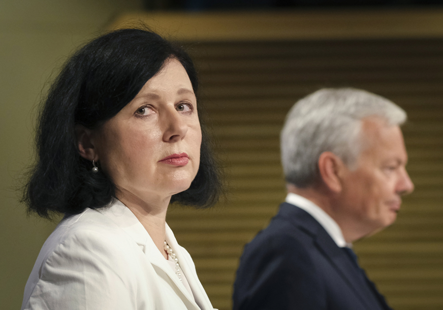 EU:s värderings- och öppenhetskommissionär Vera Jourová och justitiekommissionären Didier Reynders är ansvariga för EU-kommissionens nya årliga rapport om rättsstatsläget. Foto: