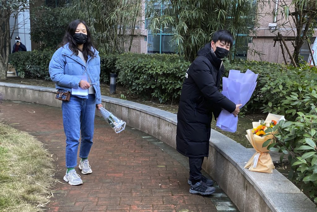 Besökare vid Wuhan Central Hospital lägger ner blommor till minnet av läkaren och visselblåsaren Li Wenliang som larmade omvärlden om det nya viruset i januari 2020. Han dog den 7 februari efter själv ha blivit smittad. Foto: AP Photo/Ng Han Guan