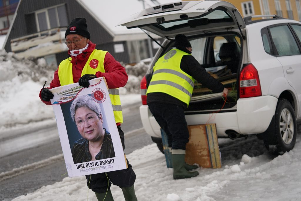 Valarbetare från vänsterpartiet Inuit Ataqatigiit sätter upp affischer i Nuuk, Grönland. Partiet – vars politiska huvudfrågor bottnar i grönländsk självständighet och klimatfrågor – sprang i valet den 6 april om socialdemokratiska Siumut. Foto: Emil Helms/Scanpix 2021 via A